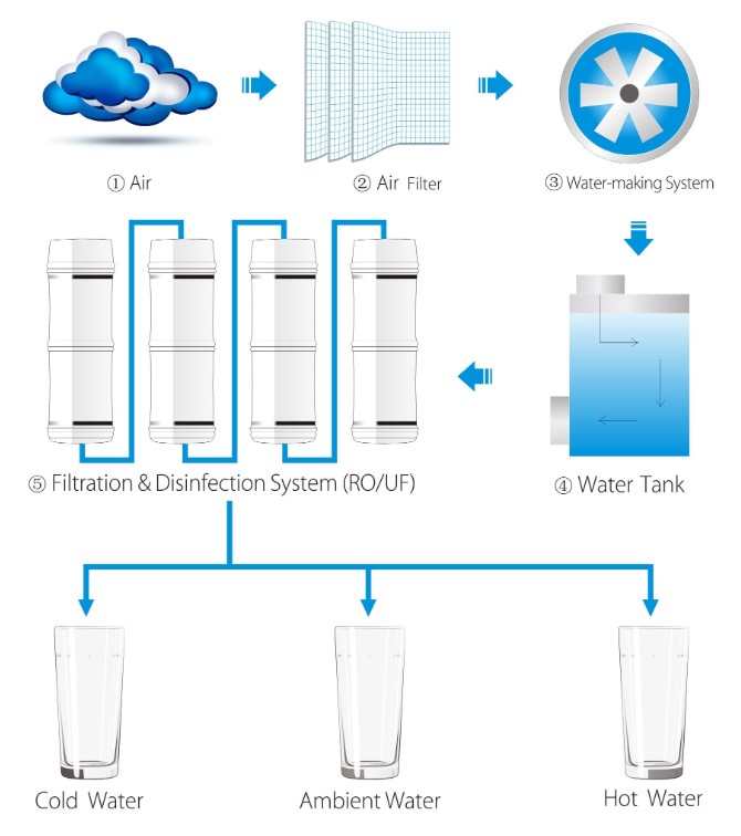 They use an advanced condensation process to extract moisture from the air and convert it into potable water. Thanks to their innovative and efficient design, they do not rely on traditional water sources.